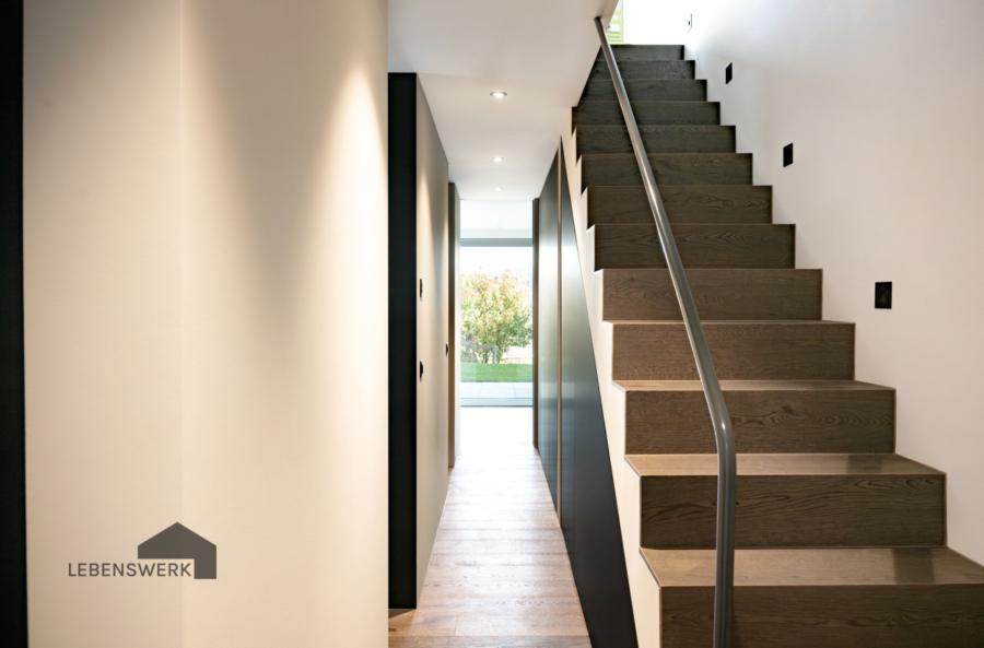 Der stilvolle Treppenaufgang mit integrierten Wandspots rundet das harmonische Gesamtbild ab und führt ins lichtdurchflutete Obergeschoss.