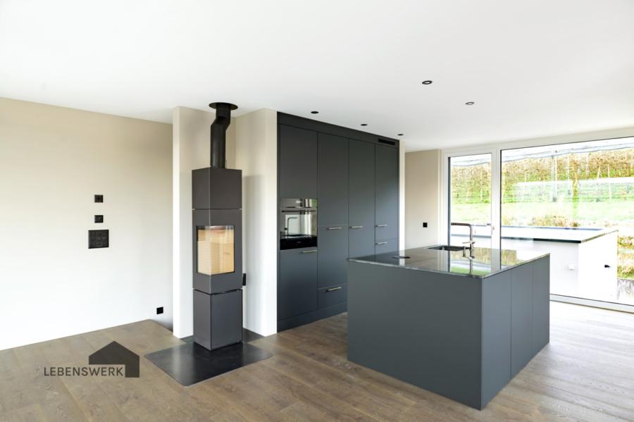 Die offene, lichtdurchflutete Wohnküche begeistert mit hochwertigen Markengeräten, einem stilvollen Cheminée und direktem Zugang zum grosszügigen Balkon mit herrlicher Seesicht. Ein offenes, angrenzendes Reduit sorgt für Ordnung und hält Alltägliches dezent im Hintergrund, unauffällig, funktional und einfach smart.
