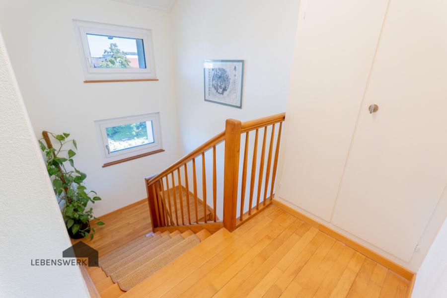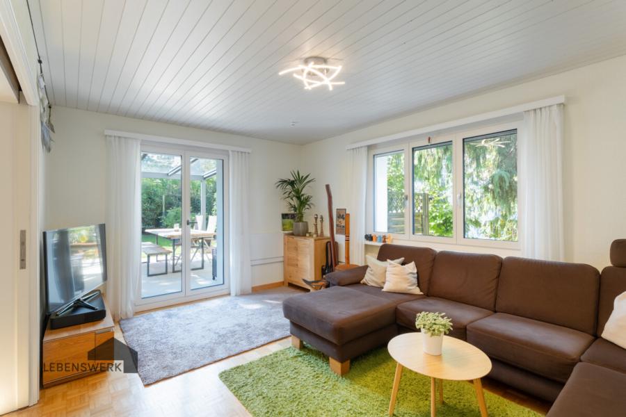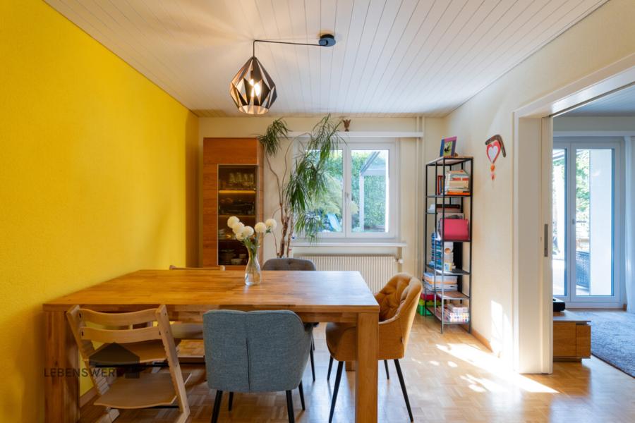 Die Liegenschaft wurde 1956 erbaut und seither laufend modernisiert. Mit neuer Küche, modernen 3-fach verglasten Fenstern, sanierten Bädern, innen- und aussenisolierter Fassade, ausgebautem Dachgeschoss, überdachter Terrasse sowie einem neuen Wärmepumpenboiler präsentiert sich das Haus heute in einem sehr gepflegten Zustand. Auf rund 107 m² Wohnfläche finden Sie im Hochparterre ein helles Wohnzimmer mit direktem Zugang in den sonnigen Garten sowie eine separate Küche, die sich bei Bedarf zum Wohnraum hin öffnen liesse. Ergänzt wird die Etage durch ein praktisches Gäste-WC. Im Obergeschoss stehen drei Zimmer zur Verfügung, die sich ideal als Elternschlafzimmer und Kinderzimmer nutzen lassen. Sowohl im Schlaf- als auch im Wohnbereich sind Insektengitter und elektrische Rollläden vorhanden – für ein angenehmes, ungestörtes Wohn- und Schlafklima, besonders in den Sommermonaten. Das ausgebaute Dachgeschoss ergänzt das Raumangebot und eignet sich hervorragend als Büro, Gästezimmer oder zusätzlicher Rückzugsort. Dank Heizung und Tageslicht lässt es sich vielseitig nutzen. Familien könnten zudem die Kinderzimmer im Obergeschoss über eine interne Treppe mit dem Dachgeschoss verbinden und so zwei charmante Maisonette-Zimmer gestalten. Der liebevoll gepflegte Garten besticht durch seine Südwestausrichtung und den schönen alten Baumbestand. Obstbäume und -sträucher wie Wein, Aprikose, Johannisbeeren und Brombeeren schaffen eine grüne Oase mit mediterranem Flair. Die verglaste, überdachte Terrasse mit Sonnenstoren lädt zu entspannten Stunden im Freien ein – sei es beim Frühstück in der Morgensonne oder beim geselligen Beisammensein an warmen Sommerabenden. Über wenige Stufen gelangen Sie direkt vom Garten zu den beiden Aussenstellplätzen, was den Alltag besonders praktisch macht. Eine kleine Einzelgarage gehört ebenfalls zur Liegenschaft – sie eignet sich ideal als Velostand, kleine Werkstatt oder zusätzlichen Stauraum. Dieses charmante Haus vereint den Charakter der 1950er-Jahre mit den Vorteilen kontinuierlicher Modernisierungen, einer durchdachten Raumaufteilung und einer ausgezeichneten Lage in Kreuzlingen – ein Zuhause, das Ruhe, Nähe zum See und Wohnqualität harmonisch verbindet.