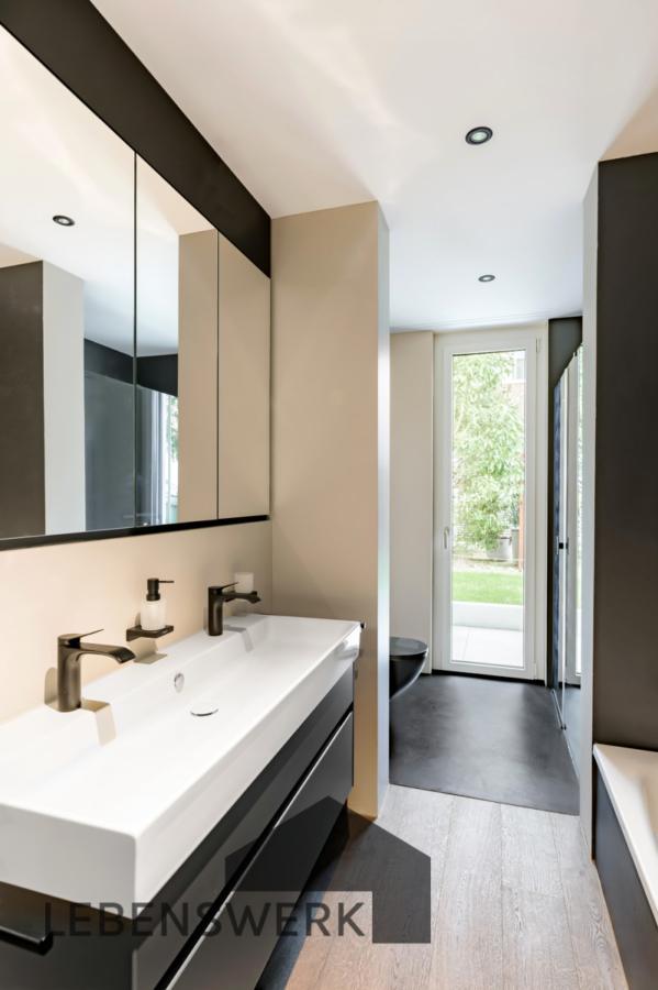 Ein modernes Gäste-WC, sowie ein elegantes Bad mit Badewanne, Doppellavabo und begehbarer Dusche – deren Wände stilvoll mit fugenlosem Beton Ciré gestaltet sind – sorgen für höchsten Komfort.
