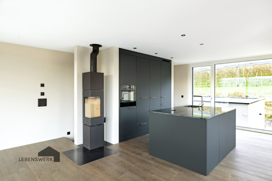 Die offene, lichtdurchflutete Wohnküche begeistert mit hochwertigen Markengeräten, einem stilvollen Cheminée und direktem Zugang zum grosszügigen Balkon mit herrlicher Seesicht. Ein offenes, angrenzendes Reduit sorgt für Ordnung und hält Alltägliches dezent im Hintergrund, unauffällig, funktional und einfach smart.