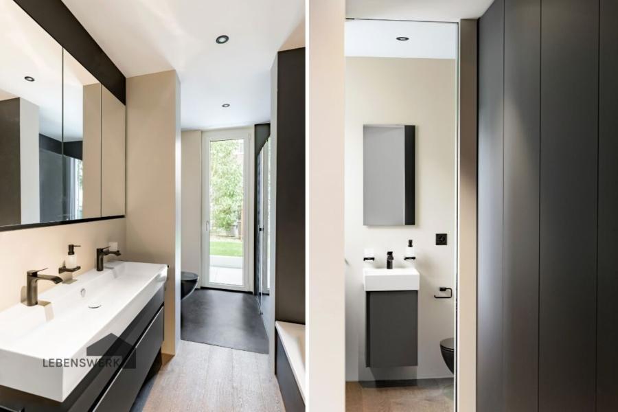 Ein modernes Gäste-WC, sowie ein elegantes Bad mit Badewanne, Doppellavabo und begehbarer Dusche – deren Wände stilvoll mit fugenlosem Beton Ciré gestaltet sind – sorgen für höchsten Komfort.