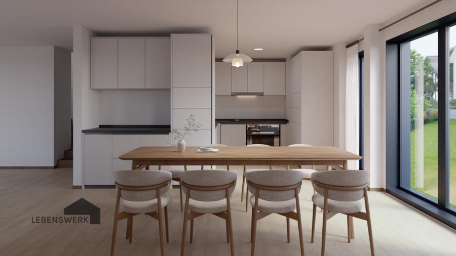 Im Innenausbau kommen ausgewählte Materialien wie Langriemen-Parkett und grossformatige Feinsteinzeugplatten zum Einsatz, die eine warme und moderne Wohnatmosphäre schaffen. Hochwertige Nolte-Küchen im oberen Preissegment, ausgestattet mit Miele-Geräten und Bora-Muldenlüfter, erfüllen höchste Ansprüche an Design und Funktionalität. Edle Sanitärausstattungen von Sanitas Troesch sowie durchdachte Einbauten wie Garderoben und Reduits unterstreichen den gehobenen Wohnstandard.