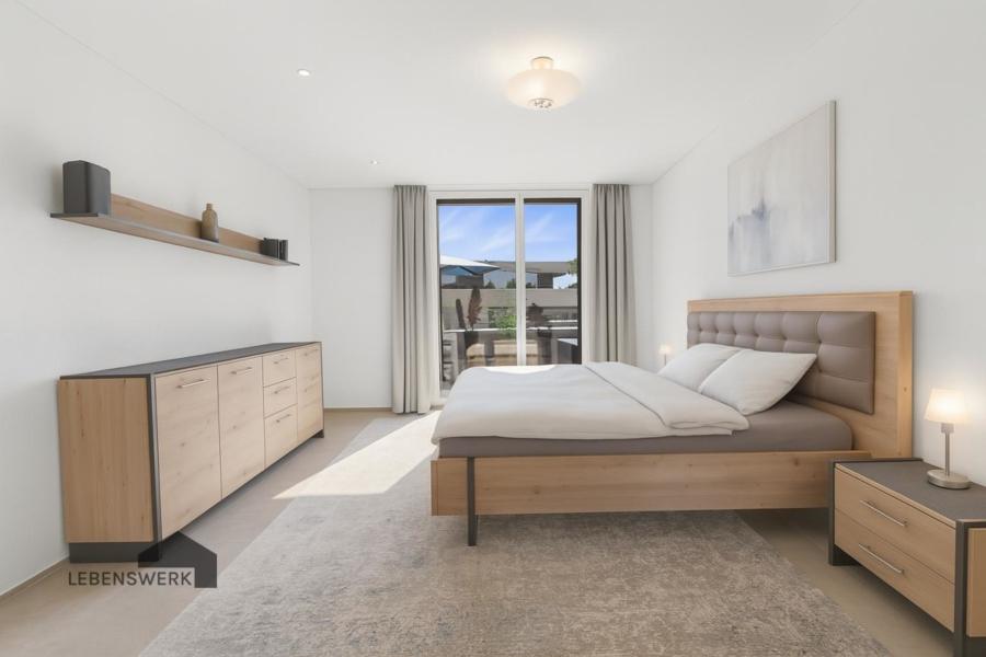 Die moderne Wohnküche mit eleganter Kochinsel stammt von Kocherhans und überzeugt mit hochwertigen Geräten von SIEMENS, einem grosszügigen Induktionskochfeld mit integriertem Muldenlüfter und einem Weinkühlschrank der Firma Liebherr – perfekt für genussvolle Abende in entspannter Atmosphäre. Ein besonderes Highlight ist der eingebaute Quooker, mit dem Ihnen jederzeit kochendes, gefiltertes oder sogar sprudelndes Wasser zur Verfügung steht. Ein liebevoll gesetztes Detail ist die dezente Trennwand, die den Essbereich optisch vom Wohnbereich abgrenzt und so ein besonders wohnliches, geselliges Ambiente schafft. Bodentiefe Fensterfronten durchfluten die Räume mit Tageslicht und holen die Natur ins Innere. Die beiden grosszügigen Terrassen sind echte Rückzugsorte. Ob Sonne am Vormittag auf der Südterrasse oder der Blick auf den See und die Abendsonne auf der Westterrasse – hier geniessen Sie zu jeder Tageszeit Ihre ganz persönliche Auszeit. Eine elektrische Sonnenstore spendet auf Wunsch angenehmen Schatten, hochwertige Mückenschutzgitter an allen Terrassentüren sorgen für ungestörte Sommerabende. Die Wohnung verfügt über zwei stilvoll ausgestattete Bäder: ein Gäste-Duschbad mit begehbarer Dusche sowie ein en Suite Badezimmer mit Dusche und Badewanne – hochwertig, modern und mit viel Liebe zum Detail gestaltet. Auch der praktische Aspekt kommt nicht zu kurz: Im Entrée und Flur sorgen durchdachte Einbauschränke für grosszügigen Stauraum. Im separaten Reduit befinden sich Regale sowie die eigene Waschmaschine und der Tumbler. Ein privates Kellerabteil sowie zwei komfortable Tiefgaragenplätze runden das Angebot ab. Dank Lift gelangen Sie bequem in die vierte Etage – barrierefrei und komfortabel. Diese Attikawohnung ist mehr als ein Ort zum Wohnen. Sie ist ein Zuhause zum Ankommen, Durchatmen und Geniessen.