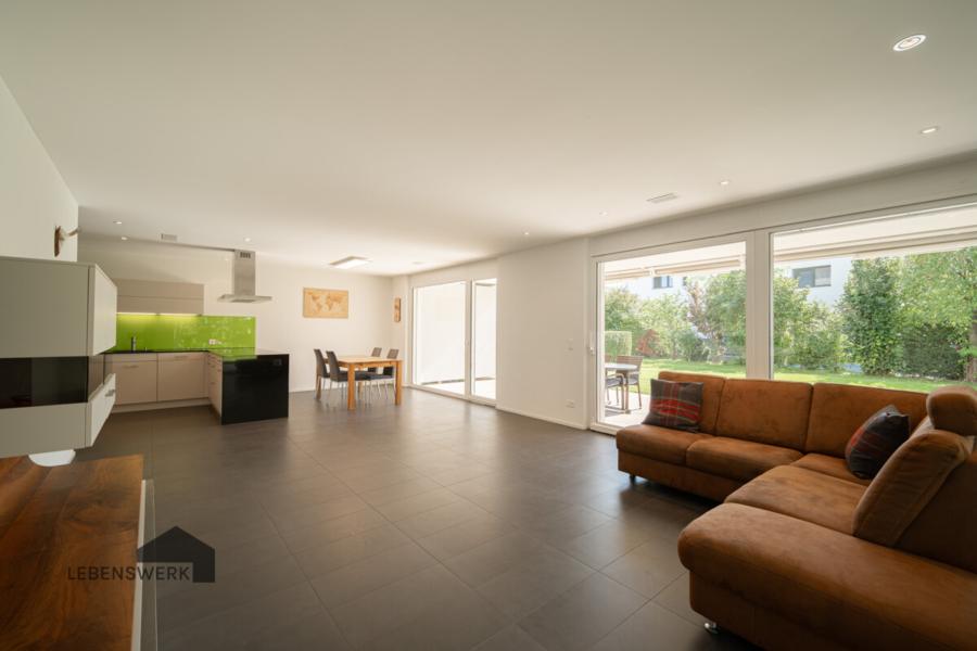 Ein besonderes Highlight ist die ca. 49.9 m² grosse, nach Süden ausgerichtete Terrasse. Daran schliesst sich der gepflegte, südwestlich ausgerichtete Gartenanteil im Sondernutzungsrecht an, der den Wohnraum nach draussen erweitert – ideal für spielende Kinder, einen kleinen Gemüsegarten oder entspannte Stunden im Freien. So entsteht ein harmonisches Zusammenspiel von drinnen und draussen, das spürbar Lebensqualität schenkt.