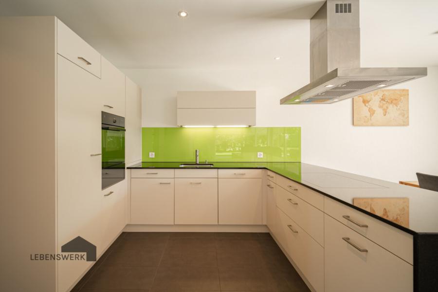 124 m² und einer hellen, offenen Architektur. Bodentiefe Fenster lassen den ganzen Tag über viel Licht in die Räume und schaffen eine freundliche, einladende Atmosphäre. Der Wohn- und Essbereich mit offener Küche ist das Herzstück der Wohnung – hier verschmelzen Kochen, Geniessen und Zusammensein auf harmonische Weise. Während Sie am Herd stehen, schweift Ihr Blick bereits hinaus ins Grüne.