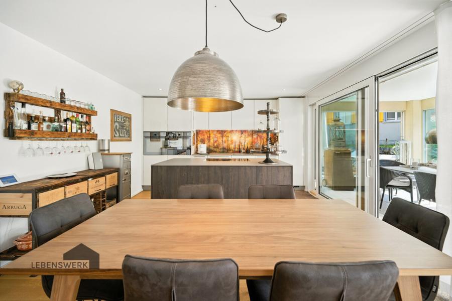 Der offene Wohn- und Essbereich mit Inselküche ist hell, grosszügig und der zentrale Treffpunkt der Wohnung. Von hier aus gelangst Du direkt in den Wintergarten, wind- und regengeschützt, unbeheizt, aber fast ganzjährig nutzbar. Perfekt für entspannte Abende, Homeoffice oder den ersten Kaffee am Morgen.